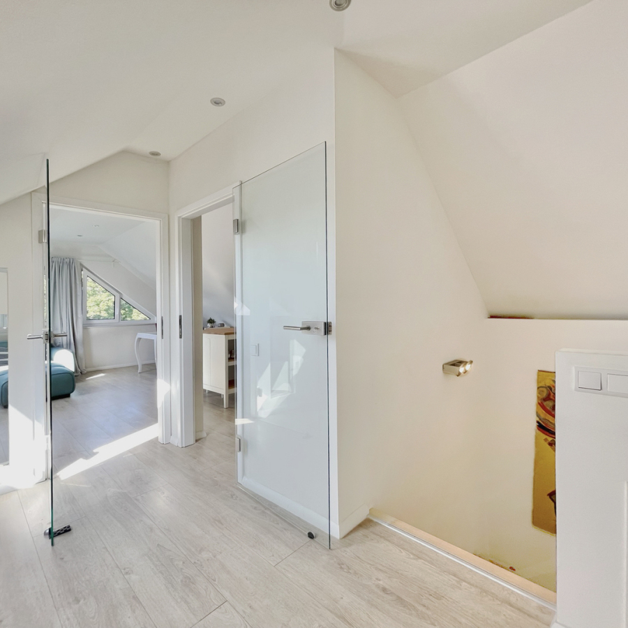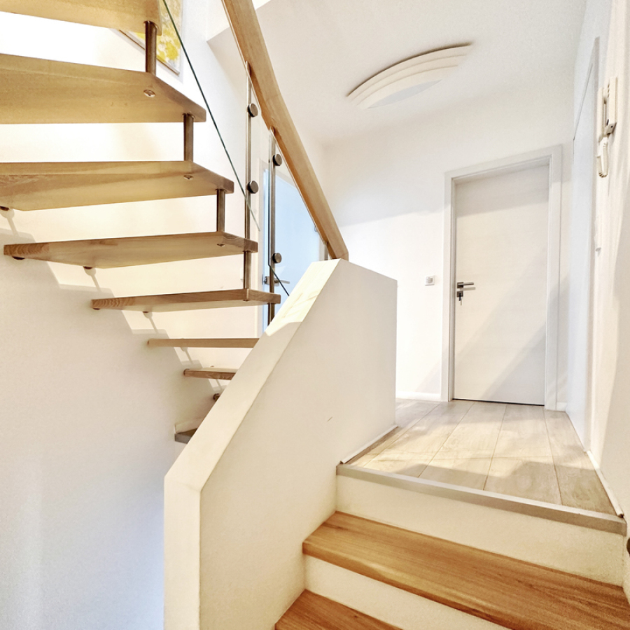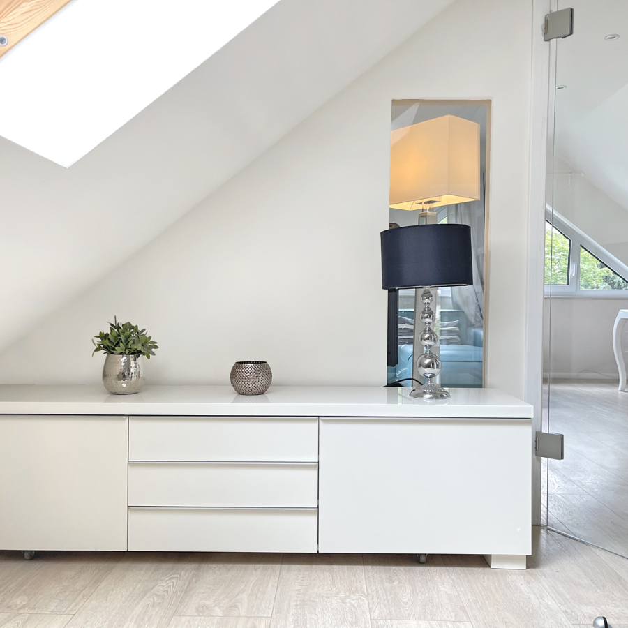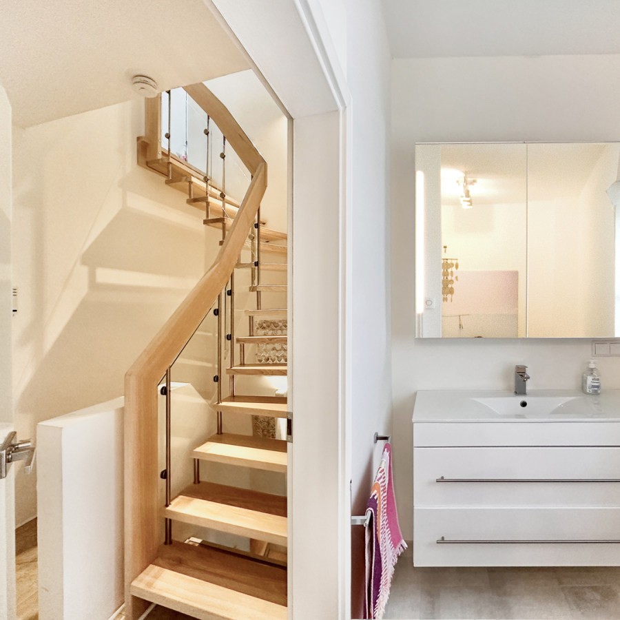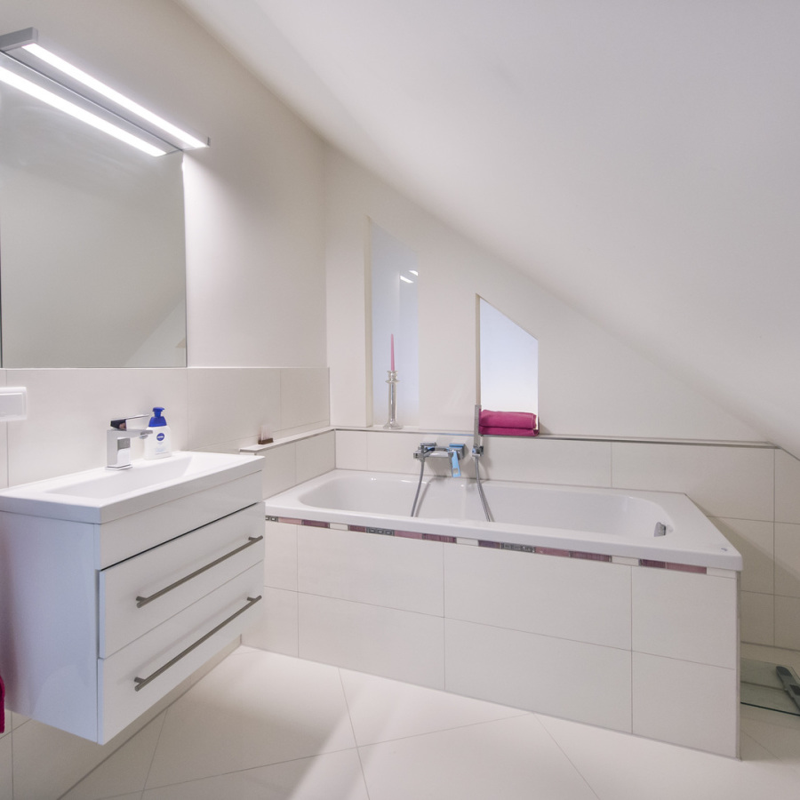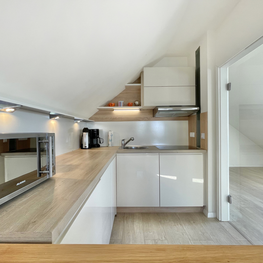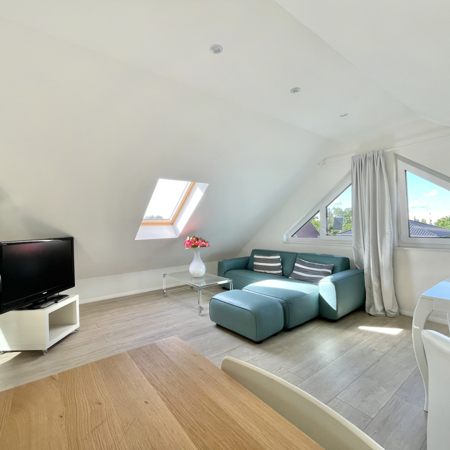 Das ausgebaute Appartement verfügt über ein Wohnzimmer, Küche, Schlafzimmer und Wannenbad. Vom Schlafzimmer gelangt ihr direkt in das Badezimmer mit Wanne, Waschtisch und WC. Zusätzlich gibt